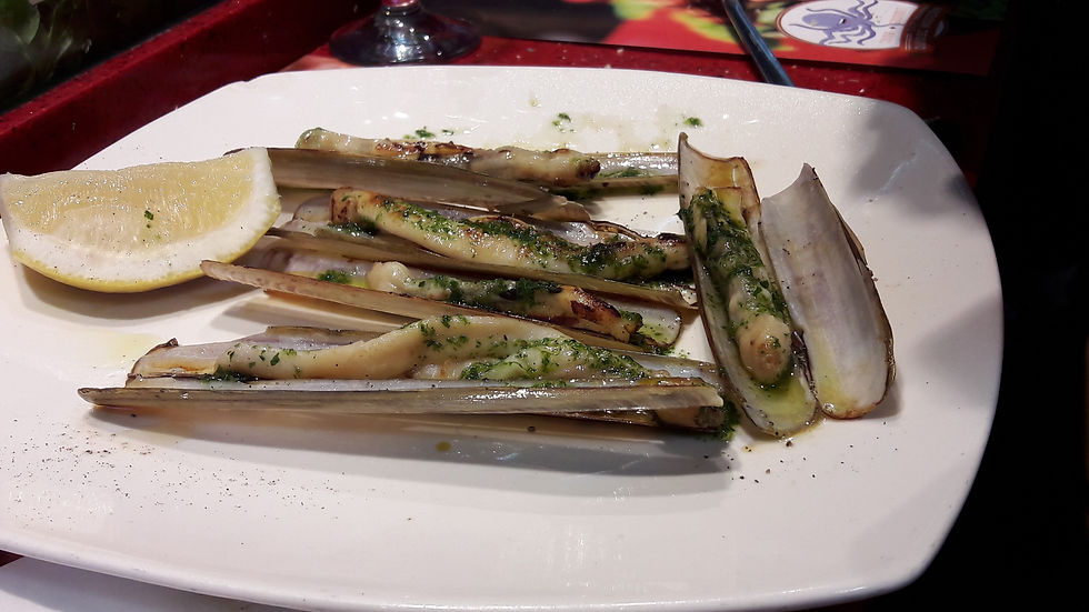 Nous nous sommes finalement arrêté au comptoir d'un petit resto qui proposait plein de spécialités. Nous avons pris des couteaux à la persillade, des pois chiches aux chorizo et aux tripes, de la chair à saucisse accompagné d'haricots blanc et des calamars à la catalane.